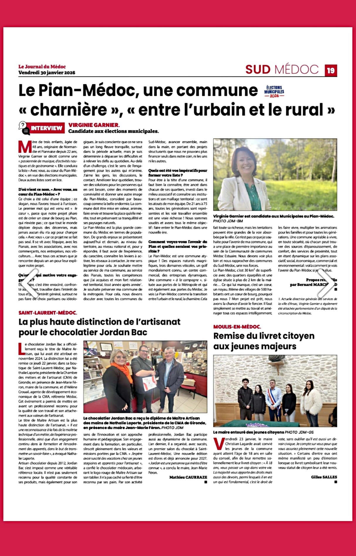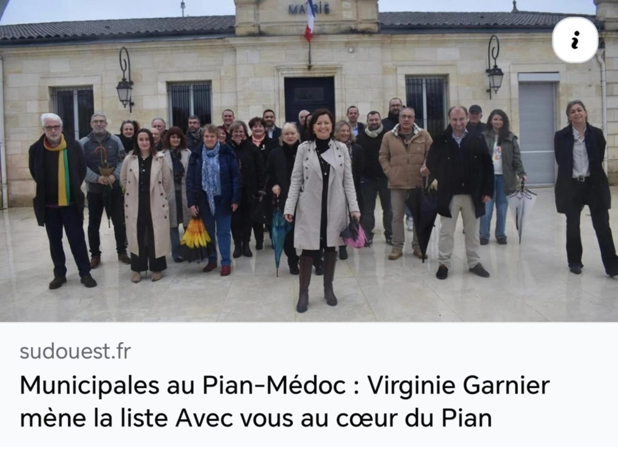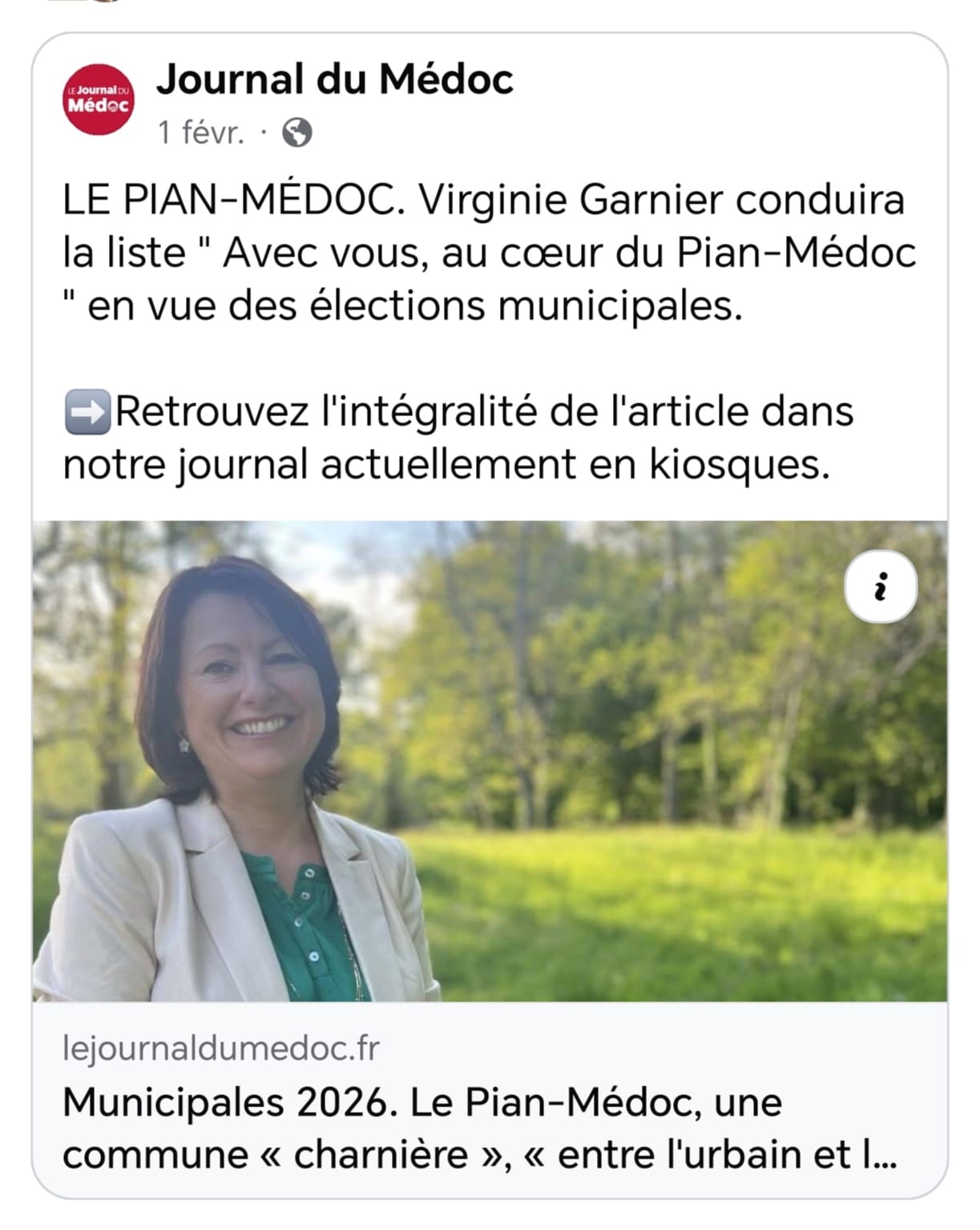 Le 15 mars 2026, vous élirez un nouveau Maire. Virginie Garnier conduit la liste "Avec Vous, au Cœur du Pian-Médoc"