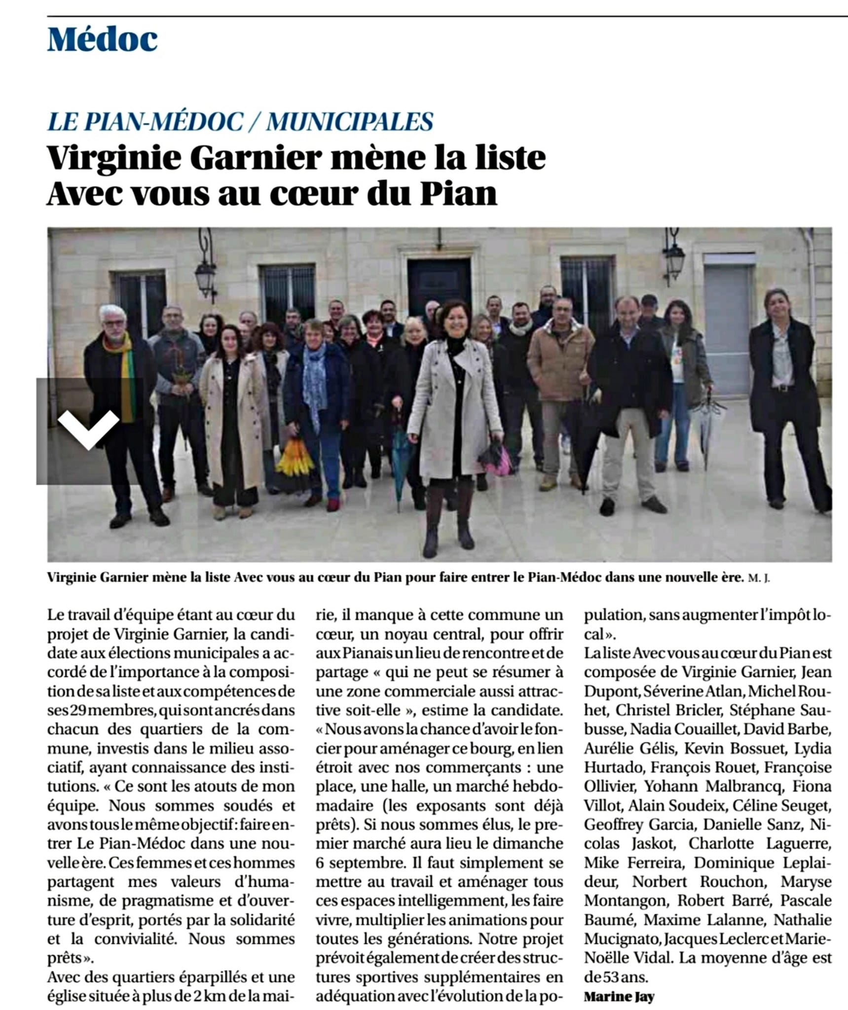 Municipales au Pian-Médoc : Virginie Garnier mène la liste Avec vous au cœur du Pian. Par Marine Jay.